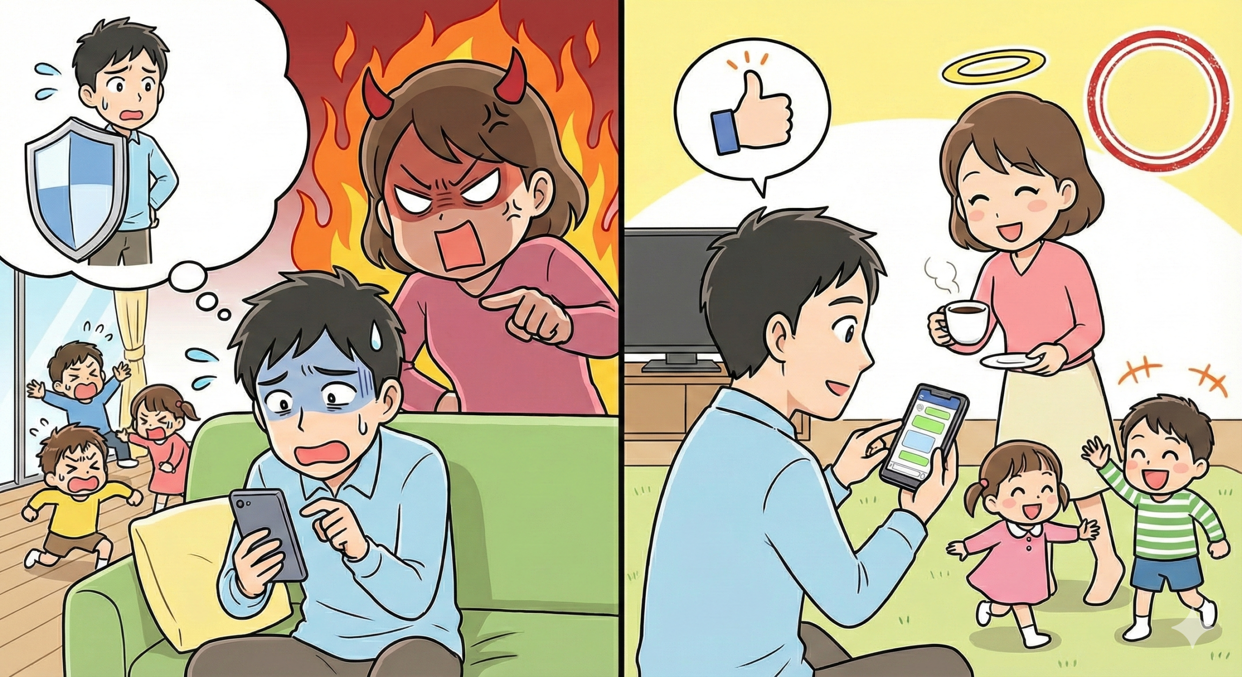 たとえ頭の中で高度なビジネスメールを作成していたとしても、妻から見れば「私一人が戦っているのに、あなたは安全地帯に逃げ込んでいる」という不公平感が爆発するのです。 したがって、「仕事だから仕方ないだろ」という正論は、「じゃあ私の家事は仕事じゃないの?」という火薬庫に火を投げる、最も危険な行為となります。