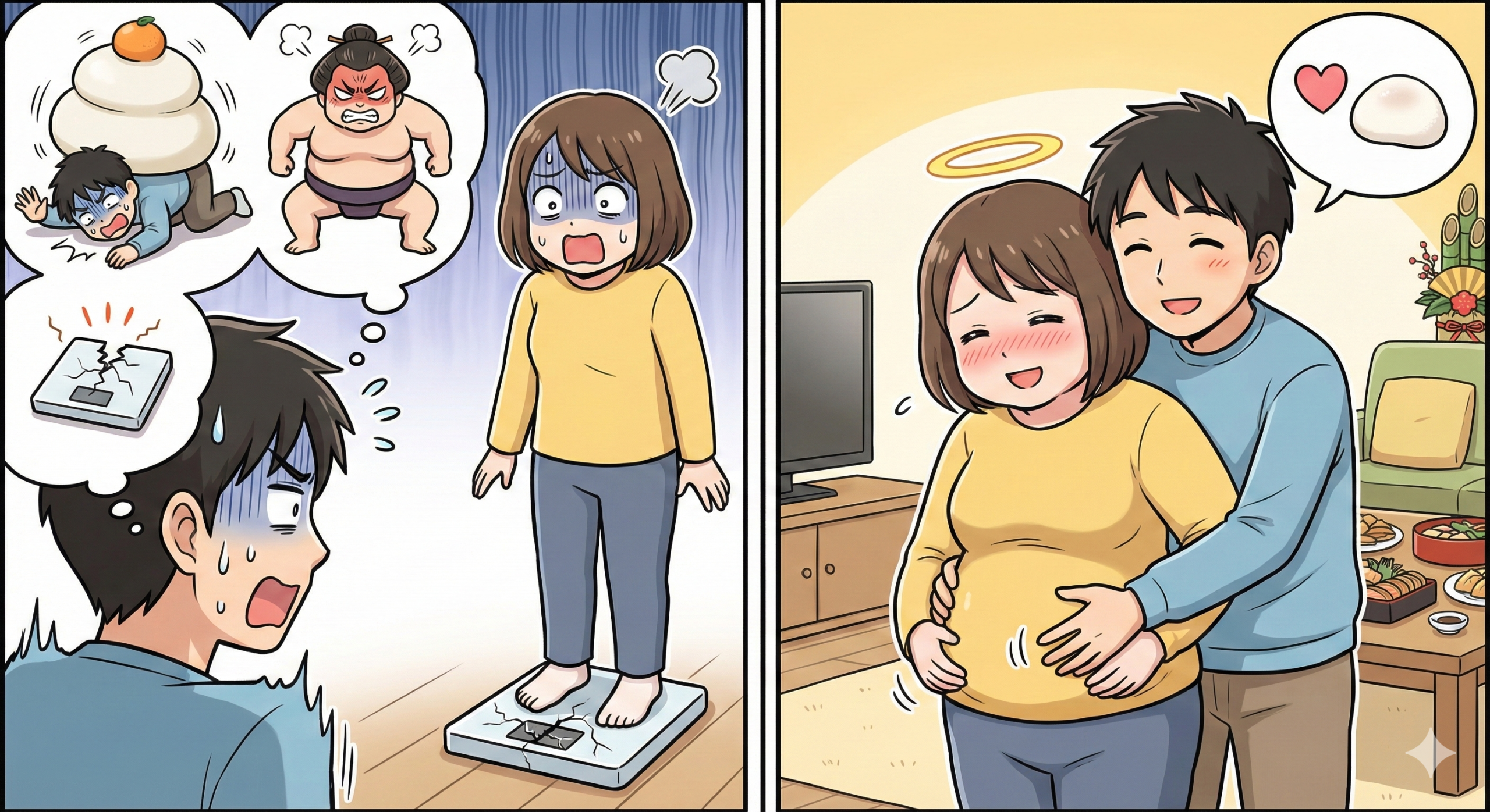 夫のセリフ例: 「いや、実は俺もベルトきついんだわ……昨日から息止めて履いてる(笑)。 でもさ、あれだけ実家で美味いもん食って、みんなで笑って過ごしたんだもん。 このお肉は『幸せの貯蓄』だよ。 楽しかった証拠を体に溜め込んだだけ。明日からまた夫婦で少しずつ消費していけばいいさ!」