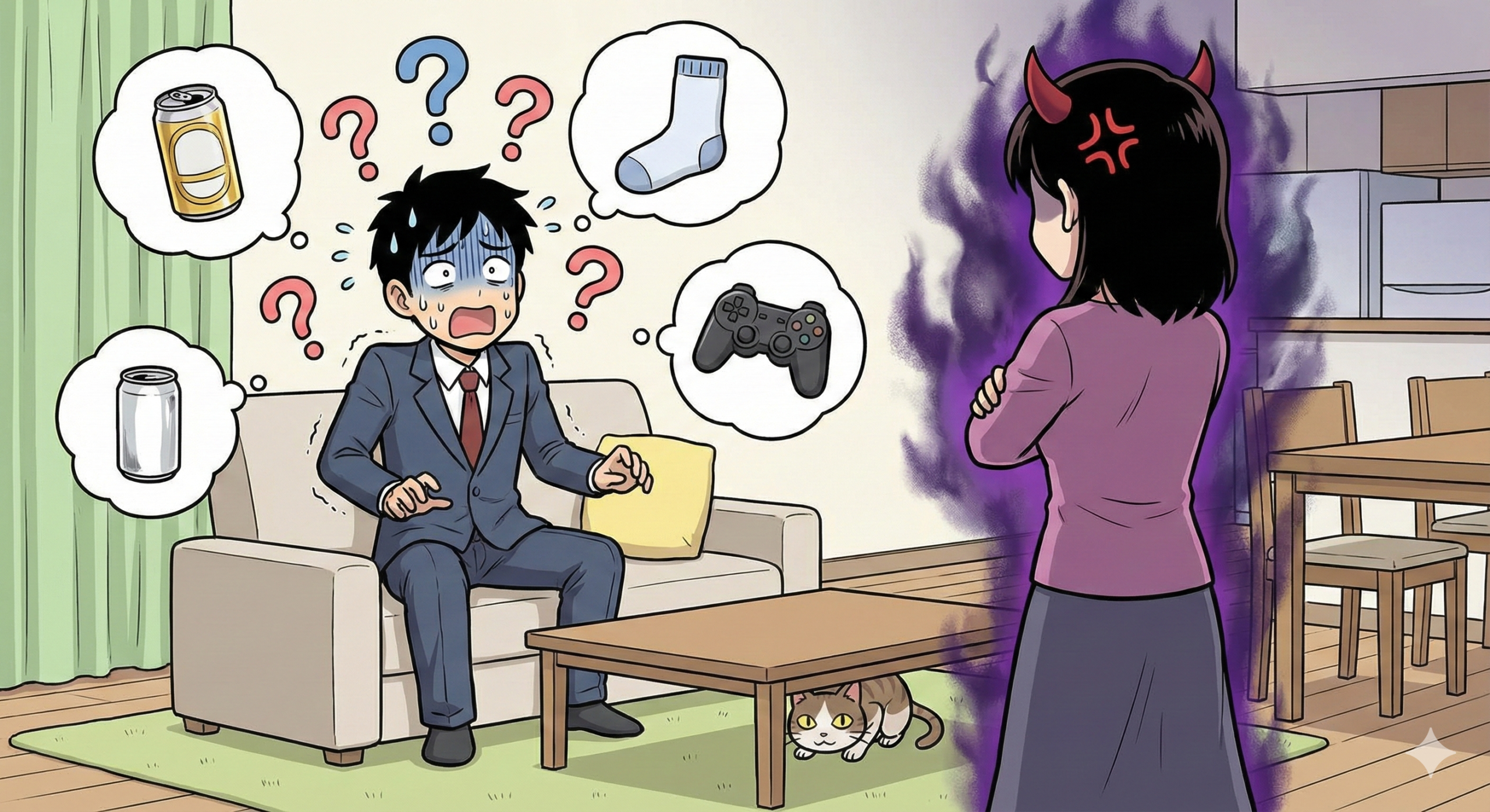 キッチンから、親の敵のように食器を置く音が響き渡ります。 さっきまで普通に「おかえり」と言ってくれていた(気がする)妻が、今は無言で背中を向け、その背中から漫画のようなドス黒いオーラを放っています。