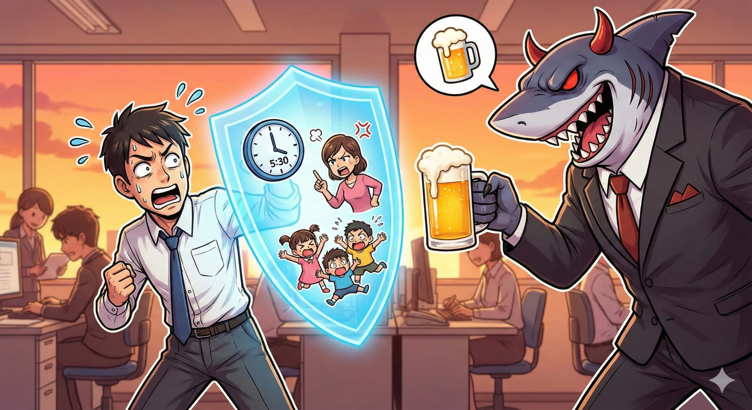 この時間は、我々サラリーマンにとって、一週間の懲役(労働)から解放される直前の、最もアドレナリンが分泌される「魔の時間帯」です。 頭の中はすでに、キンキンに冷えたビールと、愛する怪獣(子供たち)が待つ我が家のことでいっぱい。 パソコンをシャットダウンし、鞄に手をかけたその瞬間でした。 背後から、ジョーズのテーマ曲のような重低音と共に、我が部署の将軍様(上司)が音もなく忍び寄ってきます。